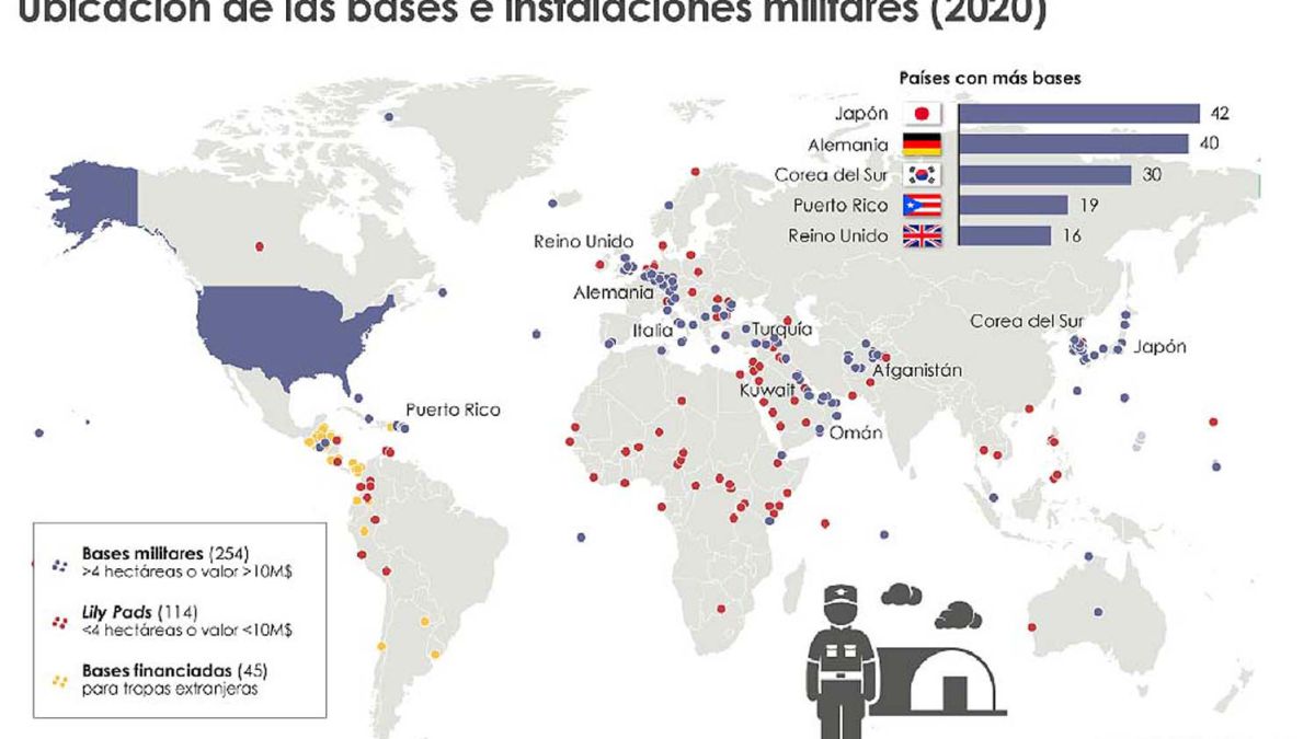 Fuente: Territorios vigilados. Telma Luzzani Diseño: Alejandro Acosta Hechavarría. Estados Unidos tiene cerca de 800 bases militares a lo largo del mundo, de ellas más de 76 en América Latina. Entre las más conocidas resaltan: 12 en Panamá, 12 en Puerto Rico, 9 en Colombia y 8 en Perú, concentrándose la mayor cantidad en Centroamérica y el Caribe.