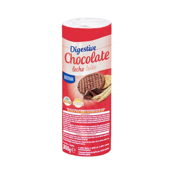 Las primeras galletas digestive con chocolate fueron producidas originalmente por McVitie's en 1925 bajo la marca Chocolate Homewheat Digestive. Los ingredientes de las galletas digestive avena con chocolate Hacendado son los siguientes: harinas 27,9% (trigo, arroz, centeno, cebada, harina integral de trigo y avena), chocolate con leche 24%.