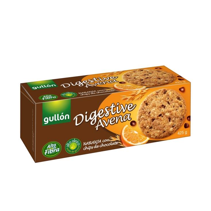 Descripción del producto. La Avena Gullón Choco Digestive está elaborada con copos de avena, pepitas de chocolate negro y aceite de girasol alto oleico. Por su alto contenido en fibra, son las galletas perfectas para darse un capricho en cualquier momento. También son una opción muy adecuada para los desayunos.