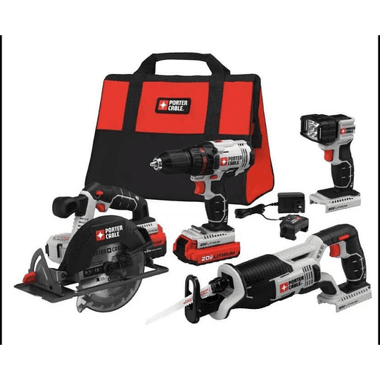Este kit combinado inalámbrico de 5 herramientas cuenta con herramientas eléctricas DEWALT que incluyen un taladro/destornillador de 20 V MAX*, destornillador de impacto, sierra circular, sierra recíproca, dos baterías de iones de litio de 20 V MAX* 2ah, cargador y una bolsa de herramientas.