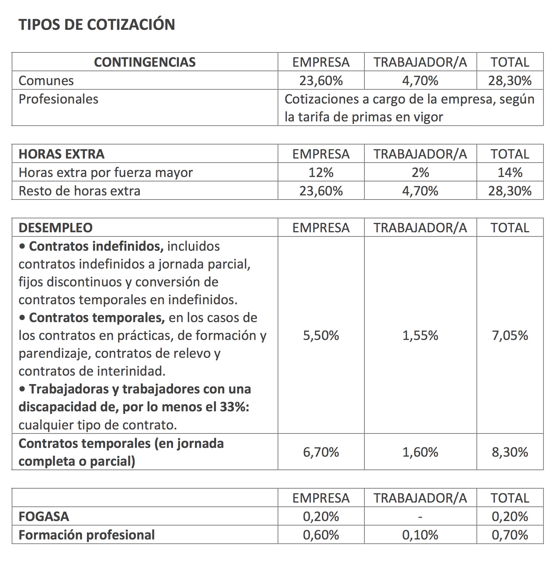 Tipos de cotización que se aplican durante 2023. - Contingencias comunes: 28,30%. 23,60% a cargo de la empresa y; 4,70% a cargo del trabajador. - Para las contingencias de accidentes de trabajo y enfermedades profesionales se aplican los porcentajes de la tarifa de primas incluida en la disposición adicional cuarta de la Ley 42/2006, de 28 de.